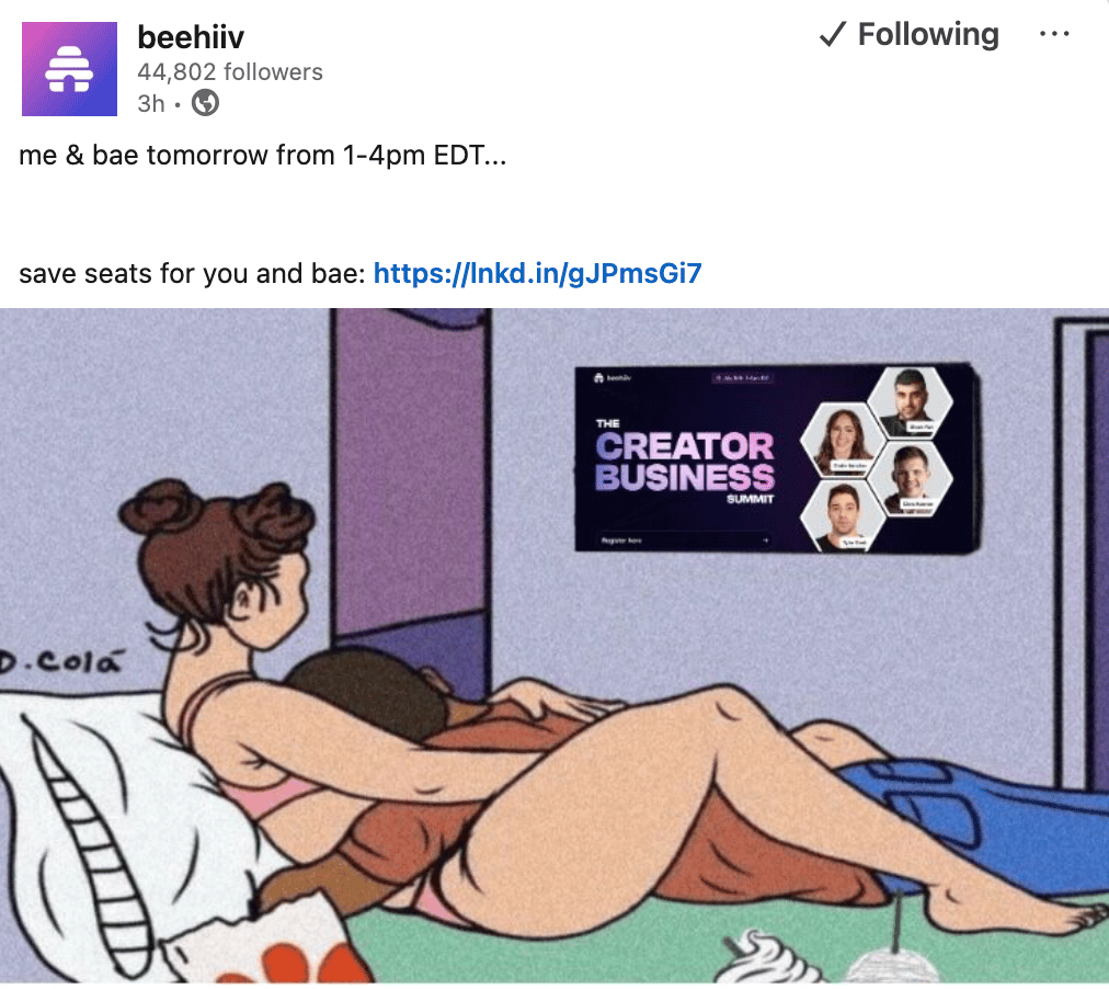 Least Robotic Sounding Company of the week goes to beehiiv. In the interest of full disclosure, Alec works at beehiiv and we are of course writing this newsletter on beehiiv. Having said that, their content is just too good not to step back and appreciate! You genuinely never know what beehiiv is going to do next on LinkedIn, and that is exactly why they are a very deserving “least robotic” winner this week. Many of beehiiv’s posts are truly helpful pieces of content about how to build a successful media business, which is a great way to stand out on LinkedIn. But what puts them over the edge as truly non-robotic is the silliness they share like the screenshot below. Your audience wants to learn, but as we’ve said before, they also want to have fun! beehiiv killed it on the silliness front this week, and for that we salute them 🐝 🤖 🚫.