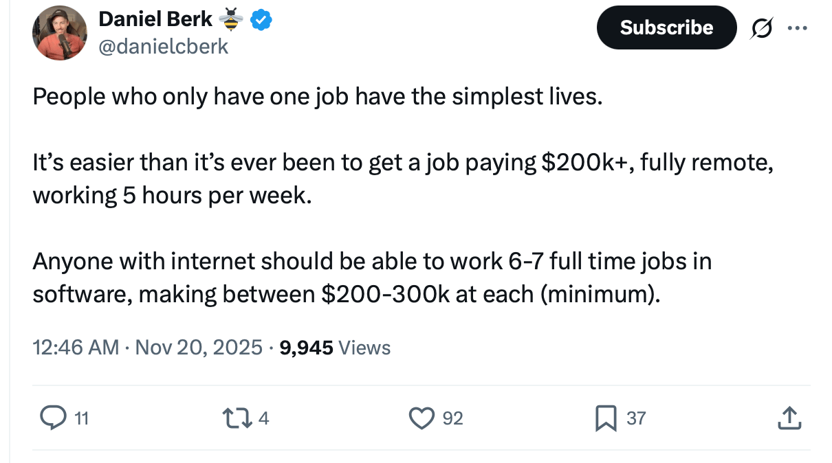 This week’s shame goes out to the parade of “rage bait” posts taking over X and LinkedIn. You know the ones: the wild claim, the humblebrag, the outrage algorithm in overdrive—like today’s viral gem (pictured)suggesting everyone should have 6-7 full-time jobs and $1.2 million for 35 hours of work every week.
