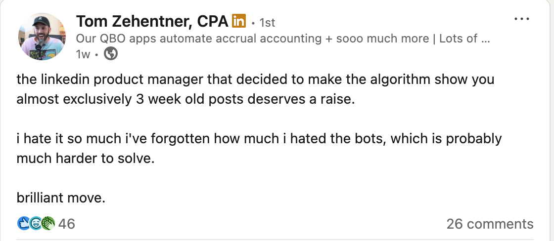 Two shoutouts for Tom in one newsletter, maybe a bit lazy? Sorry, itās not our fault the guy is giving the people what they want! Jokes aside, Tom points out something really interesting that a lot of you may have been noticing- LinkedIn seems to be really loving showing posts from 2+ weeks ago in a lot of our feeds. Is it clear why theyāre doing this? Not at the moment! Is there anything that can be done about it? Not really! The only thing that we all can control is showing up, engaging, and delivering value to the rest of the community (even if they wonāt see that value for a few weeks!).