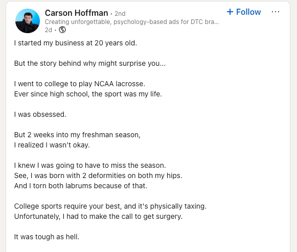 MVP (Most Vulnerable Poster) of the week goes to this post from Carson Hoffman, Founder of Kingsman and one of my personal favorite follows on LinkedIn. Carson did a few things here that made his post stand out: