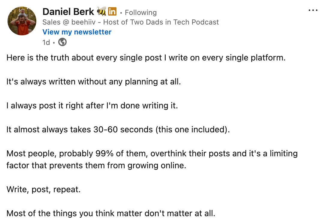 Transparent: Another key to great content is lifting up the hood- Daniel literally just told us exactly how his posts go, no filter. Too many creators on LI gate keep the good stuff, but not Daniel.