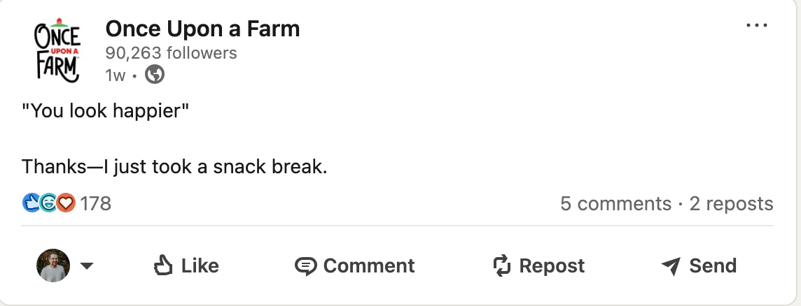 Least Robotic Sounding Company of the week goes to Once Upon A Farm. For those of you who may not be up on the latest trends in the parenting world, this brand makes delicious, healthy, organic snacks for kids (that parents sometimes steal!). This DTC brand co-owned by Jennifer Garner does a great job of making the most of their LinkedIn brand page. Look through their posts and you’ll see a perfect mix of silliness like the post above as well as legitimate business-focused posts. As the title of this weekly award suggests, the key to a successful LI brand page isn’t being silly 24/7, it’s just being less robotic. At the end of the day if you’re running a brand page you gotta post job openings and milestones for the business, but as Once Upon A Farm shows us, you gotta have some fun too!