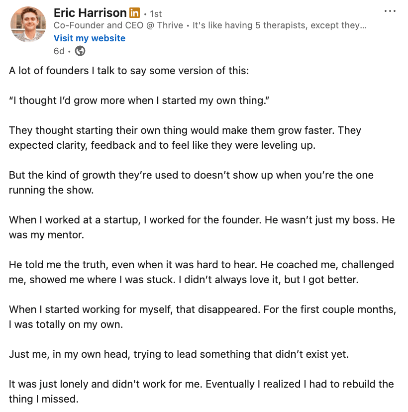 MVP (Most Vulnerable Poster) of the week goes to this post from Eric Harrison, Founder of Thrive. Eric shares a ton of raw, unfiltered content about the ups and downs of founder life and really gave people a great peek under the hood with this one. With many people masquerading as “experts” and “thought leaders” on LinkedIn, here’s why Eric’s post resonated so well with dozens of fellow founders (us included!):